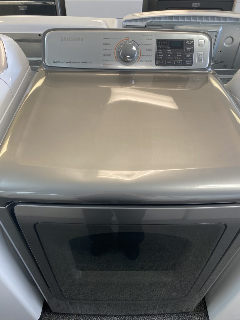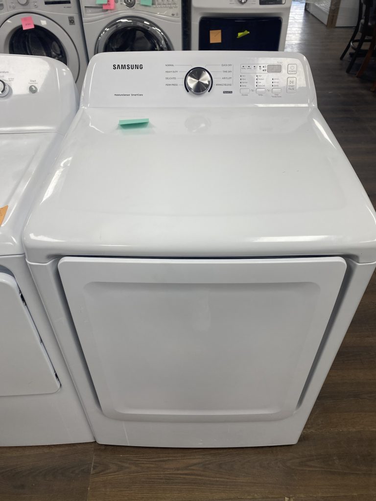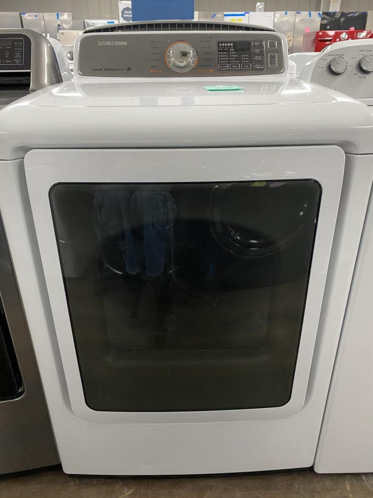 Basic Description A large-capacity 7.4 cu ft electric dryer with a front-load design—nothing side-loading here. Equipped with steam drying technology, including Steam Refresh and Steam Wrinkle Away cycles, without needing manual tank refills. Incorporates Sensor Dry, which uses moisture detection to tailor drying time and prevent over- or under-drying. Features Smart Care, allowing quick diagnosis via smartphone if issues arise. Reversible see-through door, interior drum light, filter check indicator, and child lock for added convenience. Specs at a Glance Feature Details Capacity 7.4 cu ft (equates to ~3.1 laundry baskets) Dimensions 27″ (W) × 30″ (D) × 43.9″ (H); depth with door open ~55″ Weight 126 lbs (product), 134 lbs (shipping) Power 240/208 V, 30 A circuit Drying Cycles 11 cycles, including Steam, Sanitize, Quick Dry, Heavy Duty, Delicates, Bedding Temperature Settings 4 levels: High, Medium, Low, Extra Low Dryness Levels Very Dry, More Dry, Normal Dry, Damp Dry Options Available Smart Care, Wrinkle