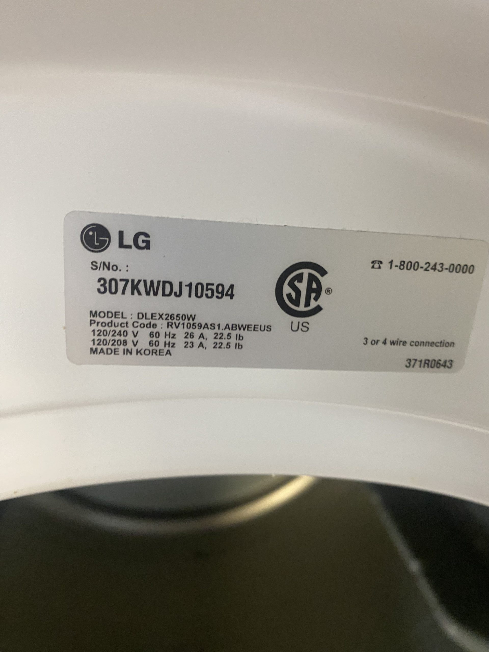 LG front load dryer DLEX2650W