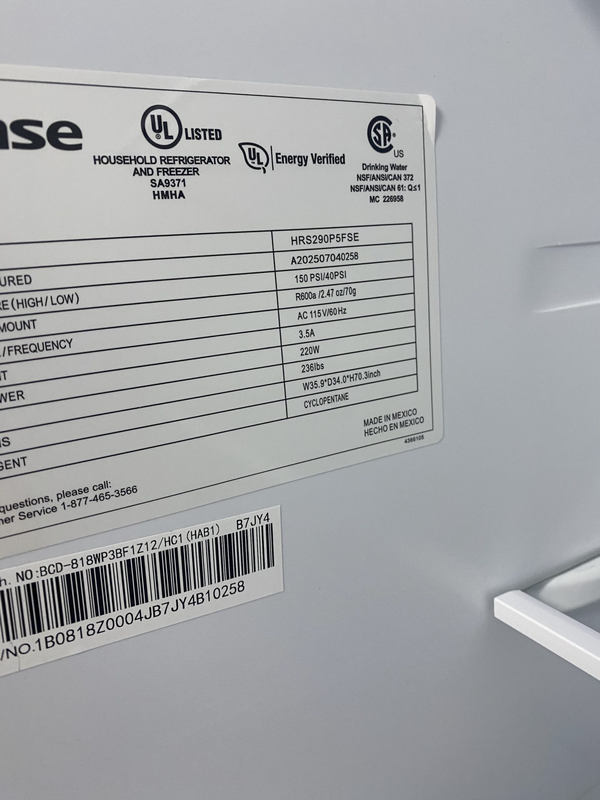 (NEW) Hiense Side By Side Refrigerator HRS290P5FSE