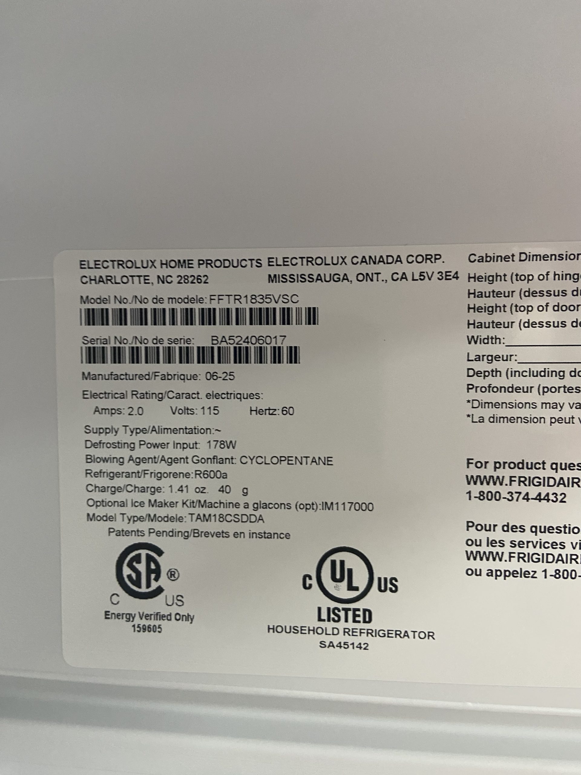 (New)Frigidaire top and bottom FFTR1835VSC