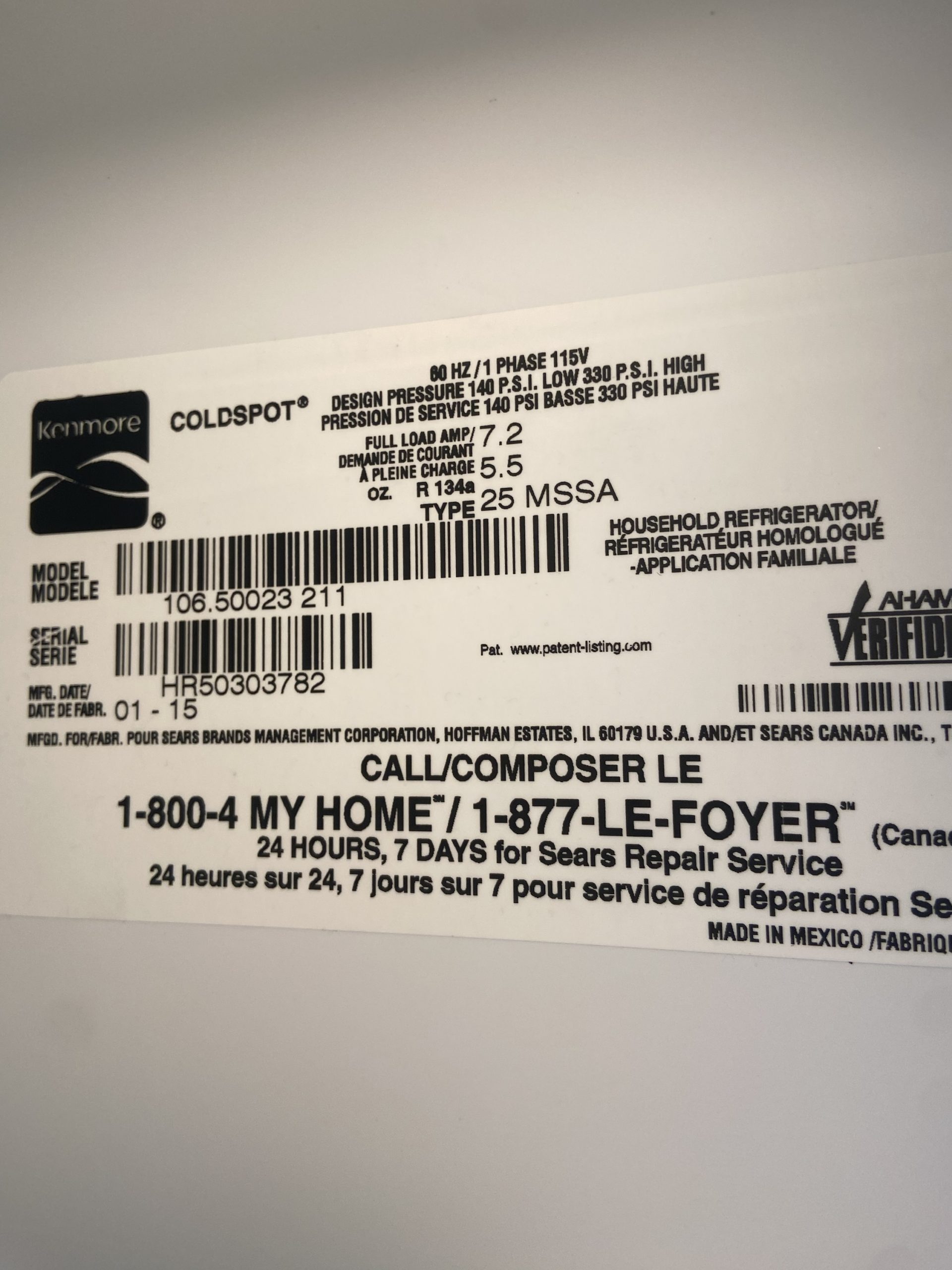 (USED) Kenmore Side By Side Refrigerator *NO ICE* 106.50023 211