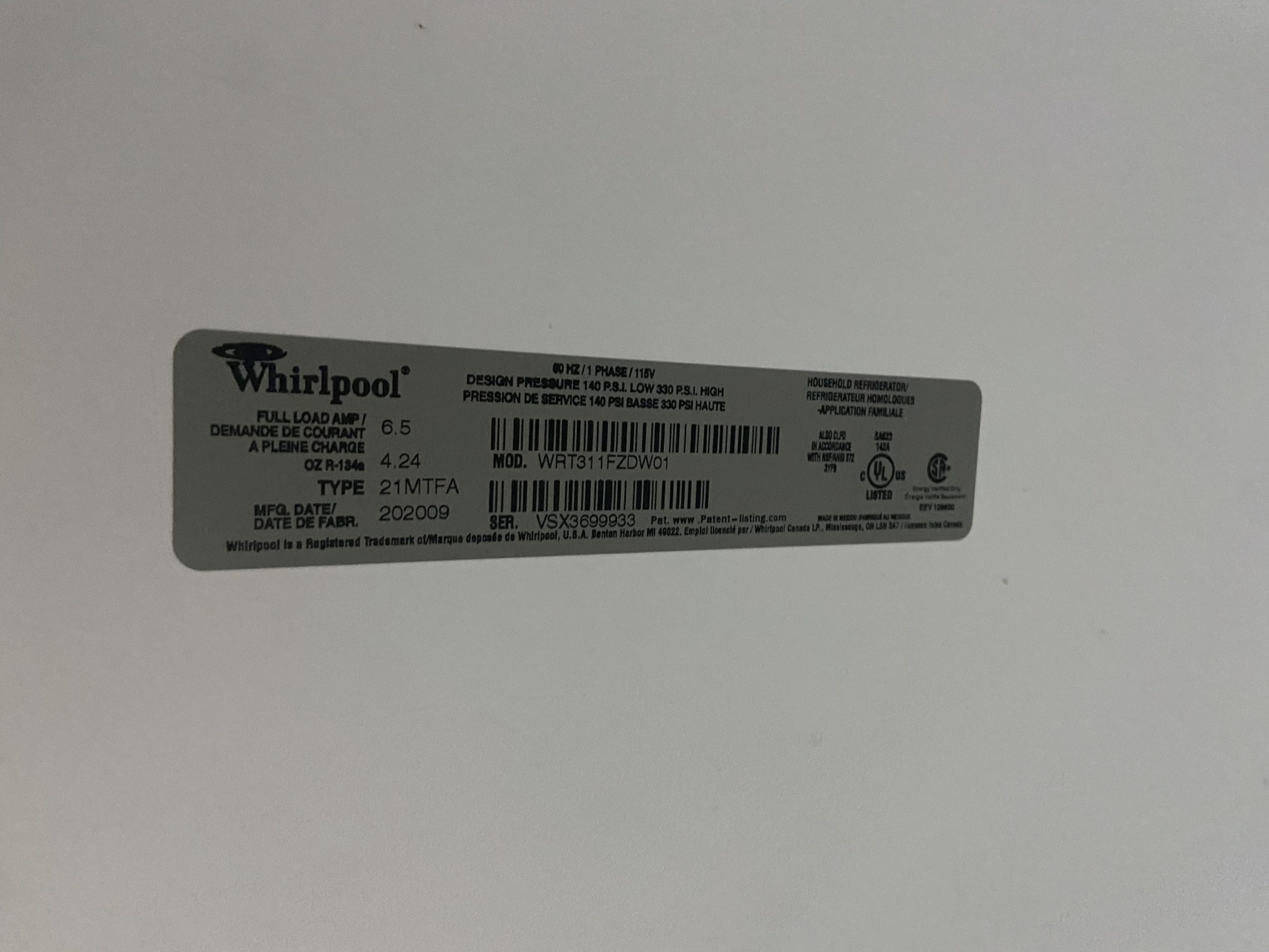 (USED) Whirlpool Top & Bottom Refrigerator WRT311FZDW01