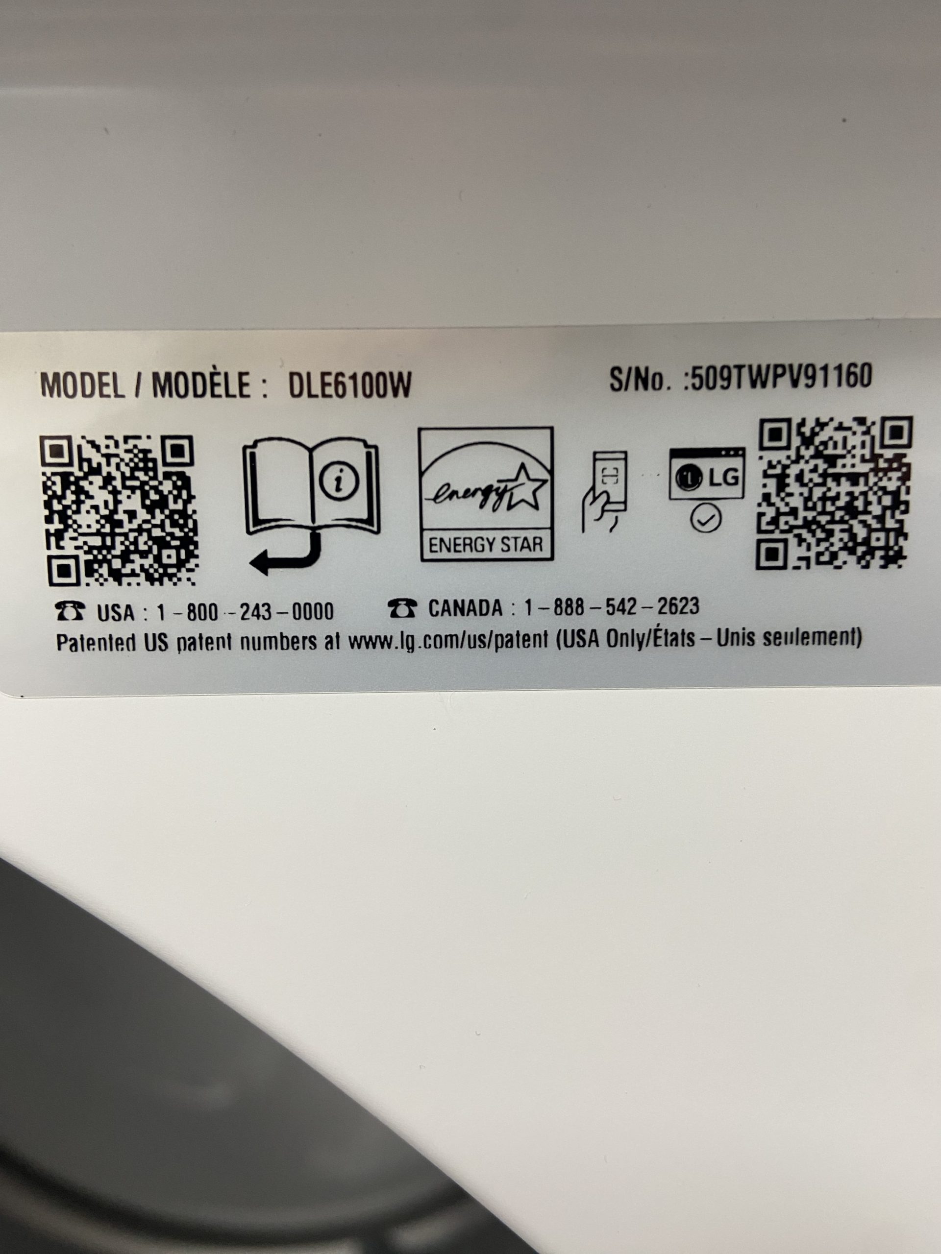 New LG front load electric dryer DLE6100W
