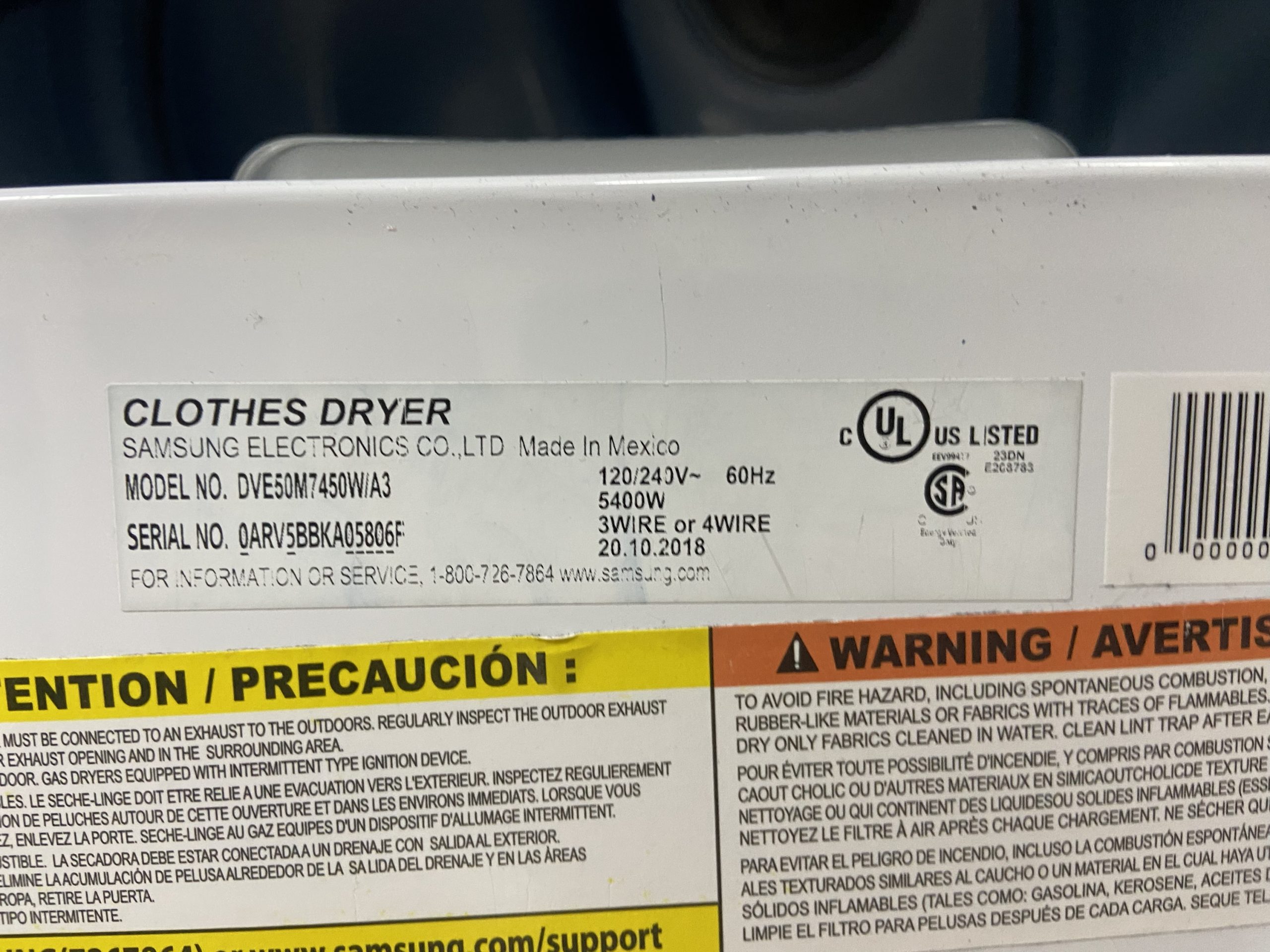 Used Samsung front load electric dryer DVE50M7450W/A3