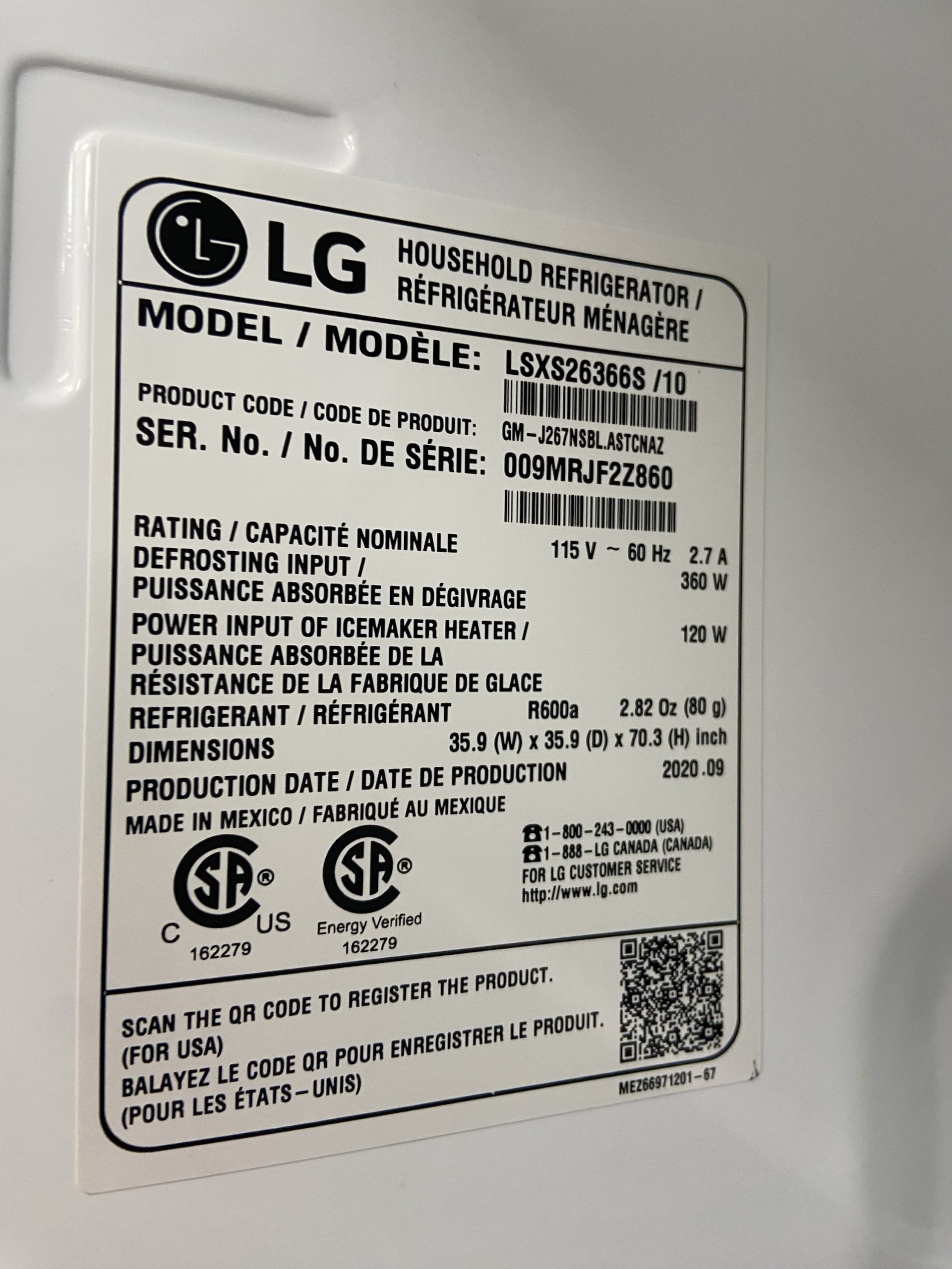 LG side by side door in door refrigerator 36” LSXS26366S /10