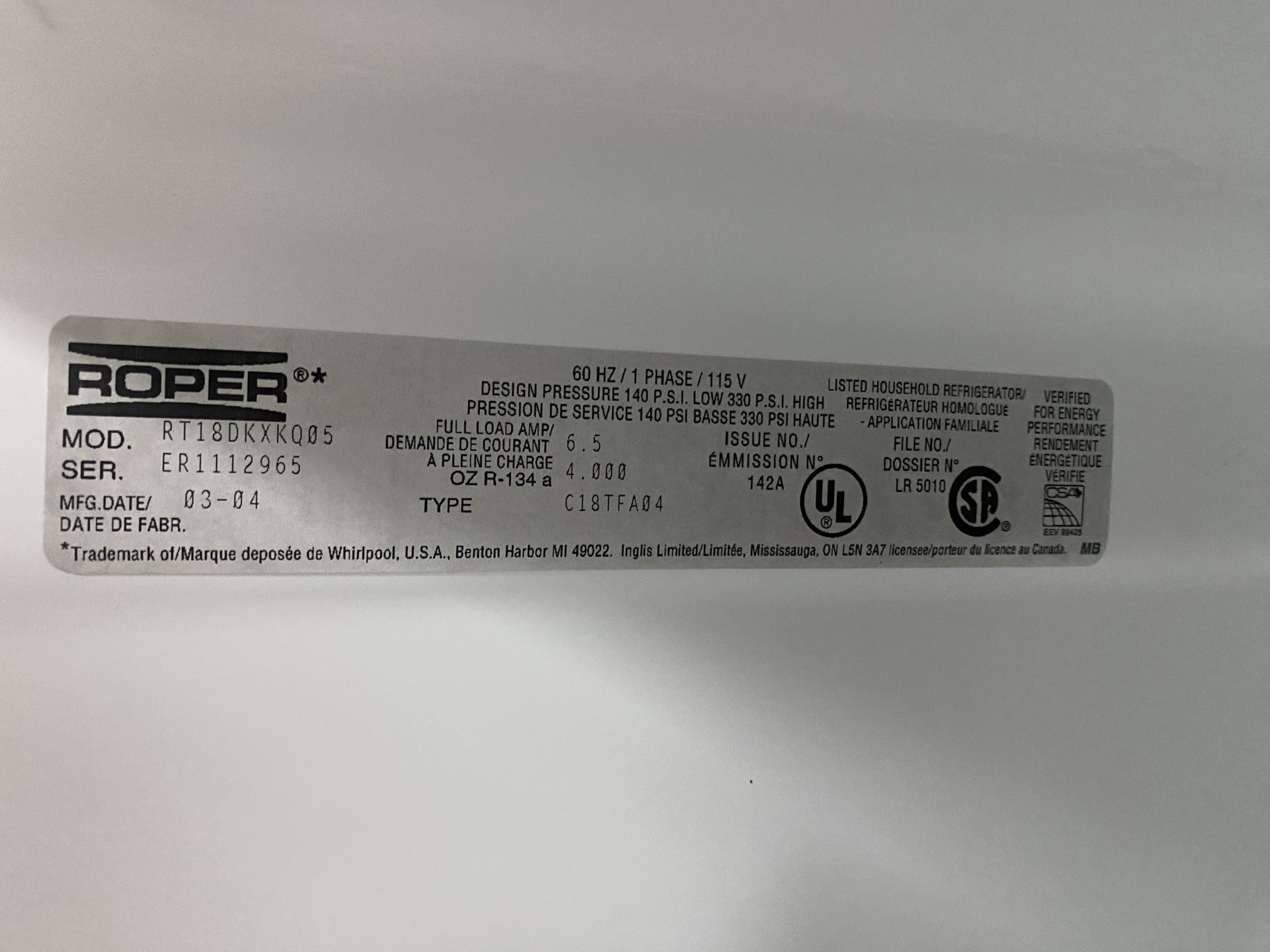 Used Roper top & Bottom Refrigerator RT18DKXKQ05